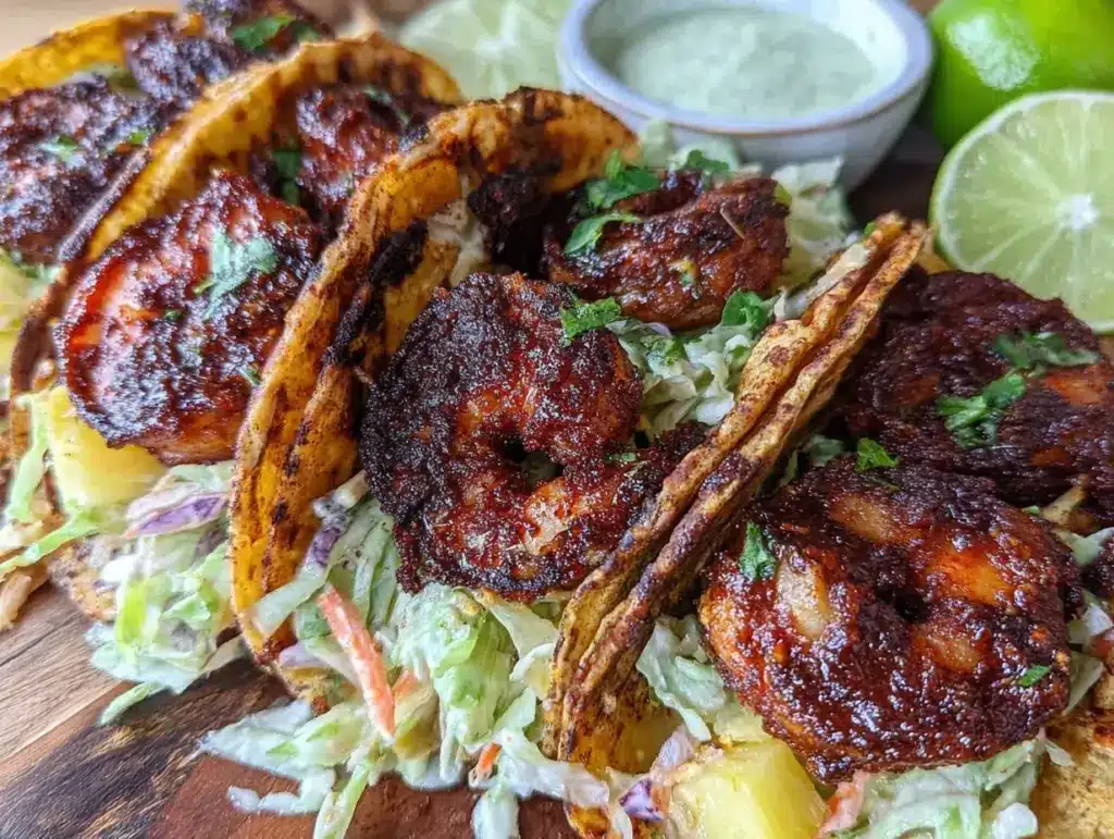 These flavorful blackened shrimp tacos are quick and easy to make, featuring a smoky spiced shrimp paired with a bright, tangy pineapple slaw for a fresh and satisfying meal.