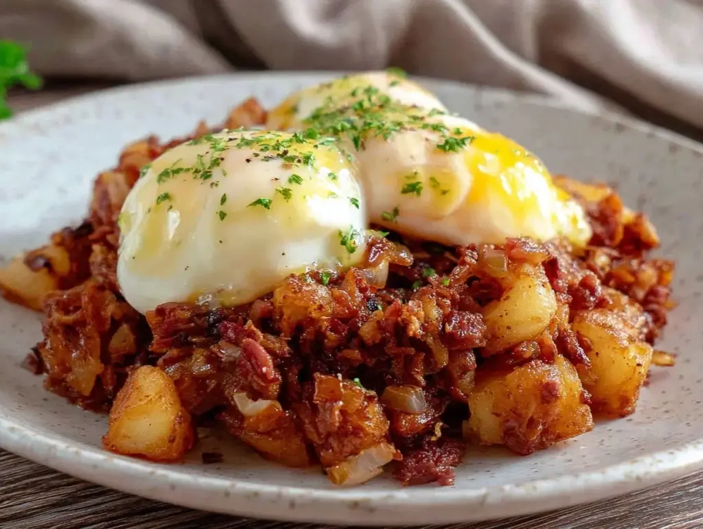 Keywords: corned beef hash, poached eggs, breakfast recipe, crispy hash, easy brunch, comfort food