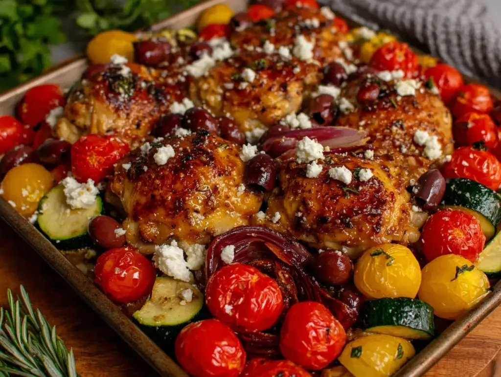 Keywords: Mediterranean chicken, sheet pan dinner, chicken thighs, feta cheese, Kalamata olives, easy dinner, weeknight meal, healthy chicken recipe